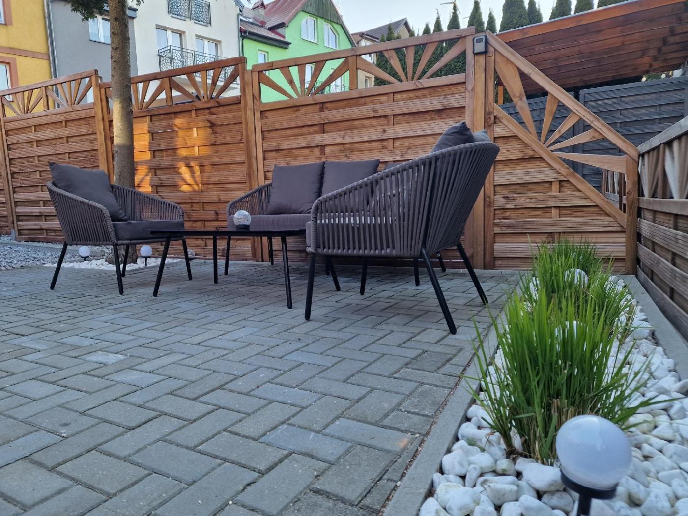 Apartament z 2 sypialniami. This air-conditioned apartment consists of 1 living room, 2 separate bedrooms and 1 bathroom with a bath or a shower. The fully equipped kitchen features a stovetop, a refrigerator, a dishwasher and kitchenware. The apartment provides a washing machine, a tea and coffee maker, a seating area, a flat-screen TV with streaming services, as well as garden views. The unit offers 3 beds. Apartament - 6 osobowy. Powierzchnia pokoju ok.: 45 mkw.